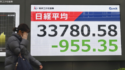 The 225-issue Nikkei Stock Average ended down 955.35 points, or 2.75 percent, from Thursday at 33,780.58, its lowest closing since Aug. 5. It lost 3,339 points over the course of the week, the largest ever weekly loss for the index, according to SMBC Nikko Securities Inc.
